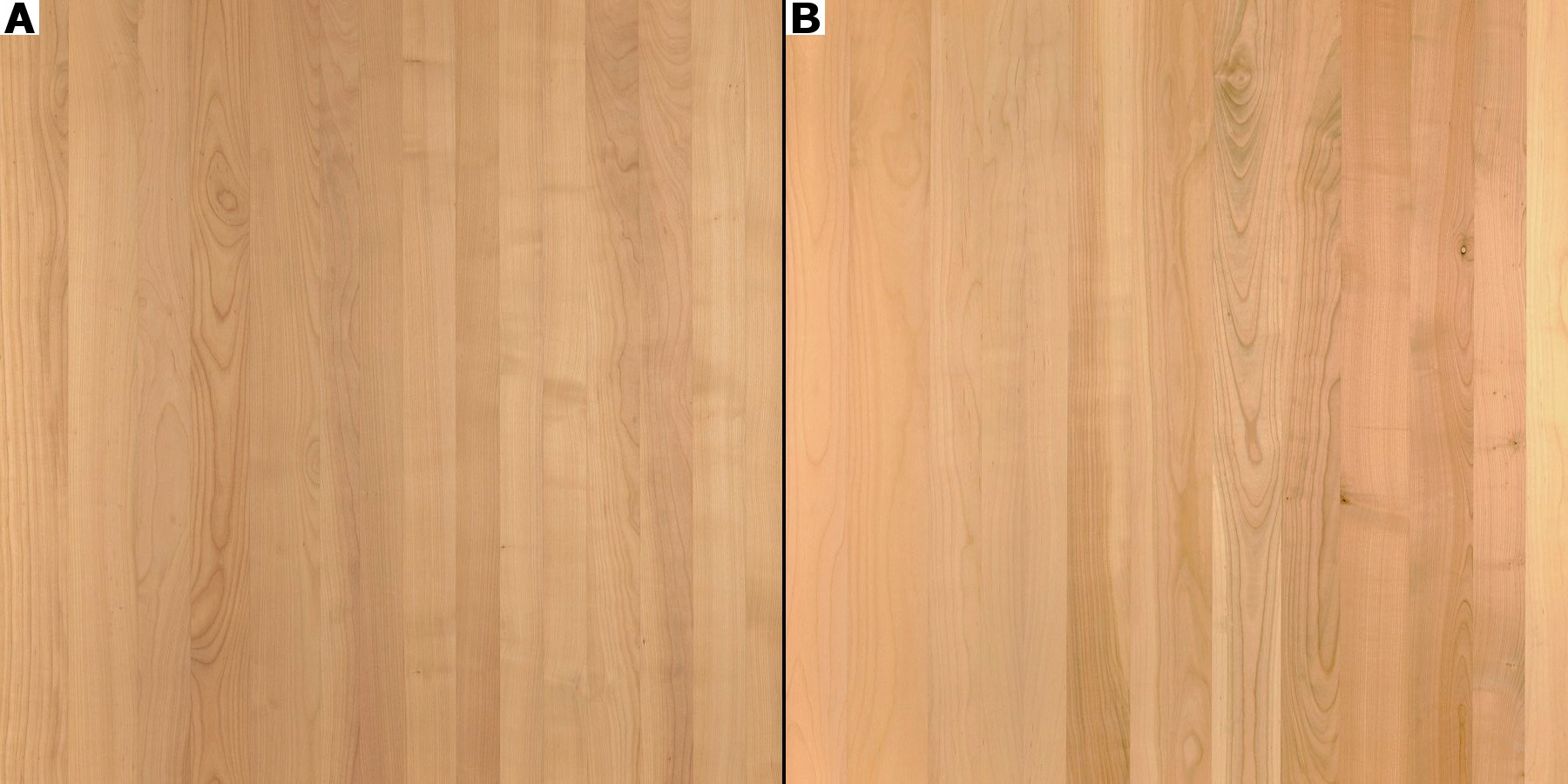 - Full length 5mm thick cherry staves of random width (50-140mm wide) bonded to a cross-banded finger jointed core of the same species - bonded to a cross-banded finger jointed core of the same species