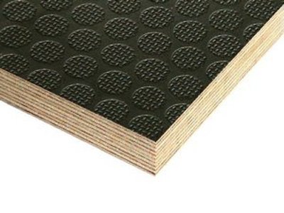 This slip-resistant, exterior plywood has a hard-wearing phenolic film overlay chemically bonded to its surface by heat and pressure. This surface layer is imprinted with a raised pattern consisting of hundreds of dark brown circular raised areas of approx. 10mm diameter in a repeating equilateral triangular configuration.