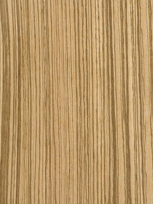 Zebrano veneer grain is usually interlocked or wavy, yielding a ribbon figure, the texture is typically medium to coarse, and the wood is lustrous.